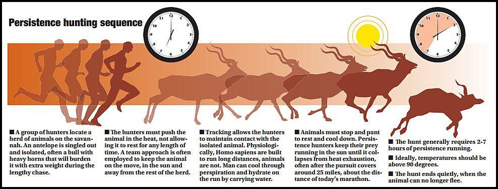 Peki av için neden koşmak zorundaydık? Bizden anatomik olarak çok daha hızlı koşabildiğini bildiğimiz hayvanlar karşısında insanın ne kadar şansı olabilir ki? Ancak iş öyle değil. Burada temel farkı yaratan şey; evrim süreci içerisinde vücutlarımızın yavaş yavaş kıldan arınması ve bu sayede ter bezlerimizin daha aktif çalışmaya başlamasıydı.