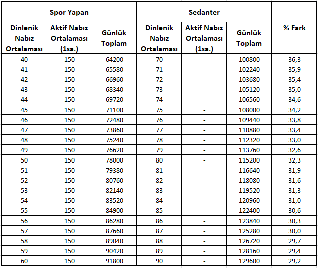 Düzenli spor yapan insanların, aktif spor yaptıkları zamanın dışındaki dinlenik nabızlarının spor yapmayan kişilere göre düşük olduğunu göz önünde bulundurmak gerekiyor. Spor yapmayan (sedanter) bir bireyin ortalama nabzı 70 – 90 aralığındadır. Bunu kabaca 80 olarak kabul edersek bu kişinin günde 115,200 kere kalbinin attığını hesaplayabiliriz. Buna karşılık günde 1 saat düzenli olarak koşan birinin dinlenik nabzının yaklaşık 40 – 60 aralığında olduğunu söylemek mümkün. Bu kişinin günde 1 saat 150 nabızla koştuğunu ve günün geri kalan 23 saatinde ise 50 nabızla yaşadığını düşünürsek kalbinin günde 78,000 kere attığını hesaplayabiliriz. Yani spor yapan bir kişinin kalbi, sedanter bireye göre yaklaşık %30 daha az atıyor. Bu nabız değerlerini rastgele yanlı seçtiğimi düşünüyorsanız aşağıda diğer nabız değerleri için ulaşılan toplam değerleri içeren excel sheet görüntüsünü paylaşıyorum: